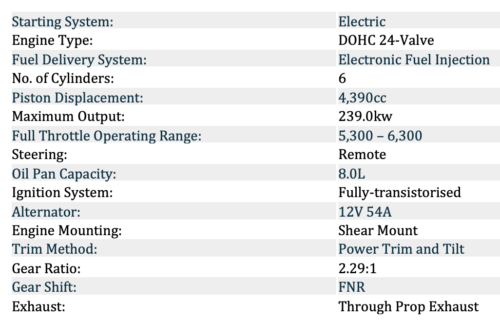 It features a New Suzuki 325 hp four stroke twin counterrotating propulsion and noise attenuation. Thus providing an outboard that is perfectly balances power and thrust with outstanding fuel-efficiency and reliability all within a lightweight design.